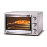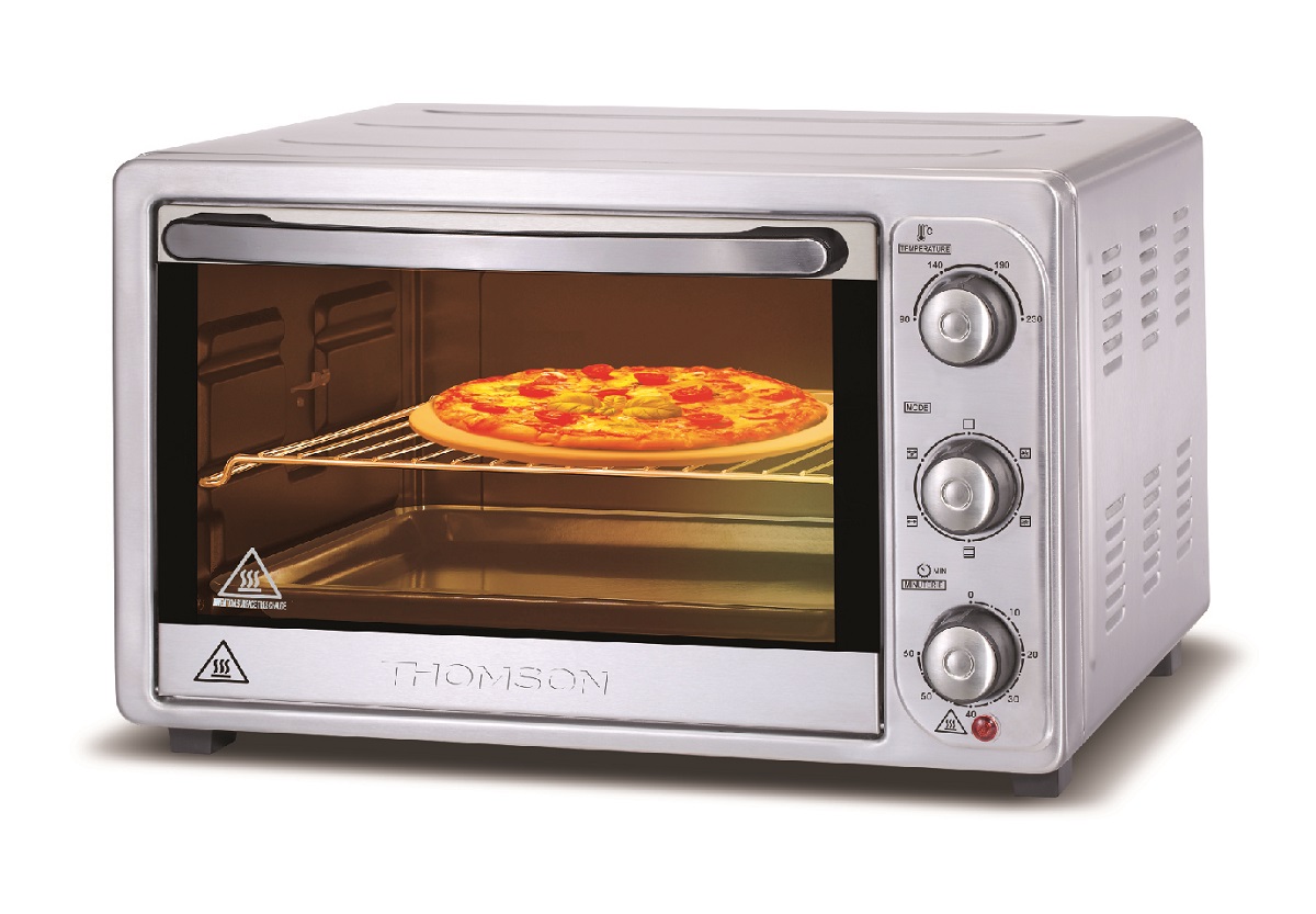 Convection naturelle, Fonction gril, Rôtisserie, Chaleur tournante, Minuterie jusque 60 min, Arrêt automatique, Livré avec pierre à pizza, grille chromée, lèche-frite, poignée et tournebroche
