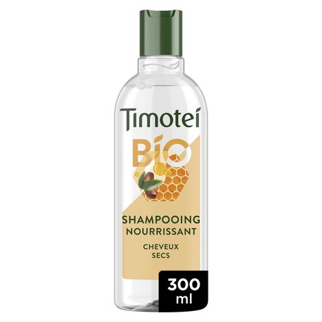 Shampooing Timotei Bio Nourrissant idéal pour les cheveux secs, enrichi en huile de jojoba et extraits de miel, dans une nouvelle bouteille transparente de 300 ml