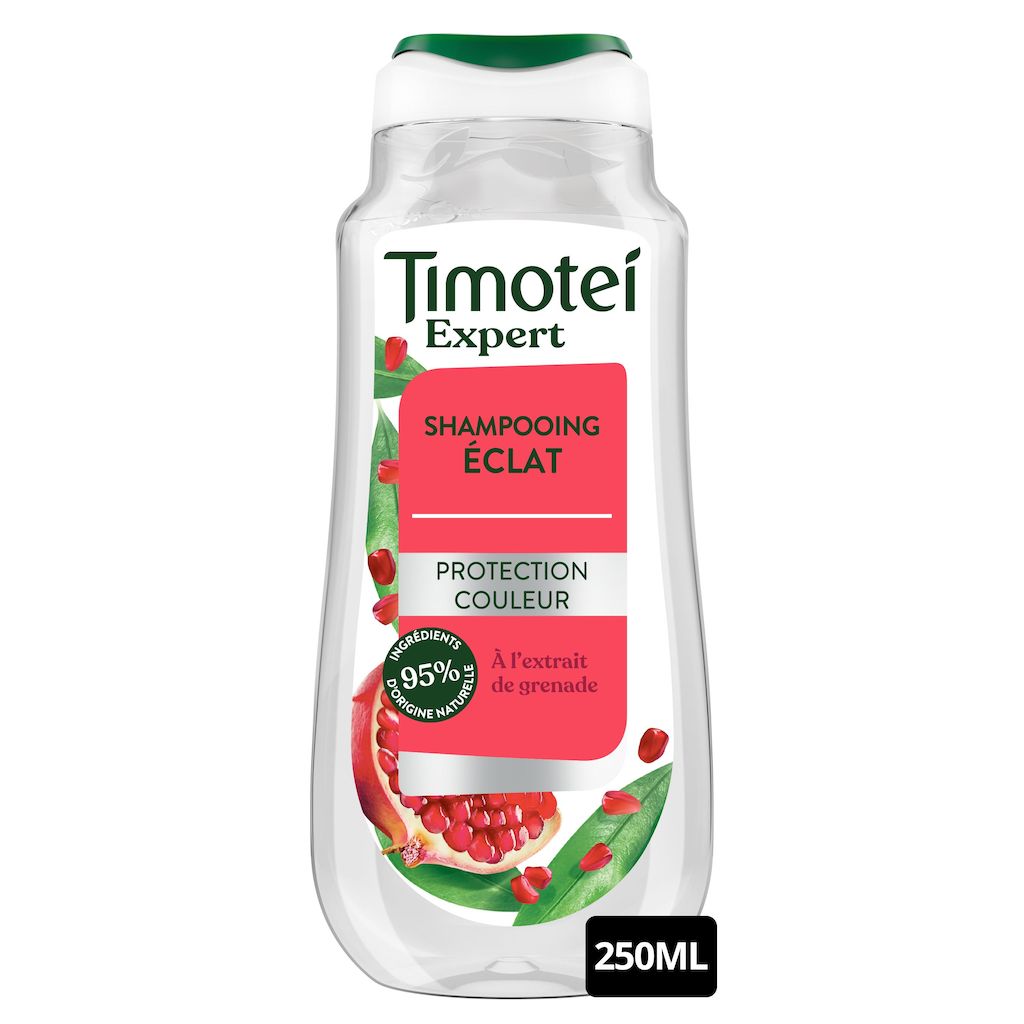Découvrez le shampooing Timotei Eclat Protection Couleur à la kératine végétale et extrait de grenade pour cheveux colorés ou méchés.