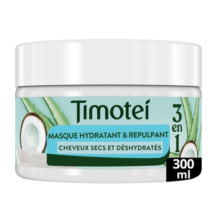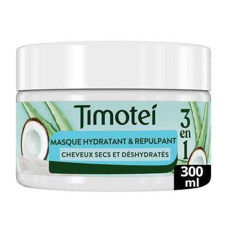 Scellez l'hydratation et apportez de la brillance à vos cheveux secs et déshydratés grâce au masque Timotei Hydratant & Repulpant 3en1 (Après-Shampooing, Masque et Soin sans rinçage). Grâce à ses actifs démêlants d'origine naturelle et son complexe d'huile de coco, notre formule douce pénètre en profondeur la fibre capillaire pour sceller l'hydratation sans alourdir, démêler tout en douceur et prendre soin de vos longueurs jusqu'aux pointes. RÉSULTATS : Une hydratation longue durée avec un usage régulier - Des fibres capillaires repulpées et revitalisées - Des cheveux visiblement plus doux, légers et brillants. La formule contient 98% d'ingrédients d'origine naturelle, sans silicone pour offrir à vos cheveux un volume naturel. Testée dermatologiquement. Pour encore plus d'hydratation, complétez votre routine avec le shampooing et l'après-shampooing Timotei Hydratant & Repulpant.