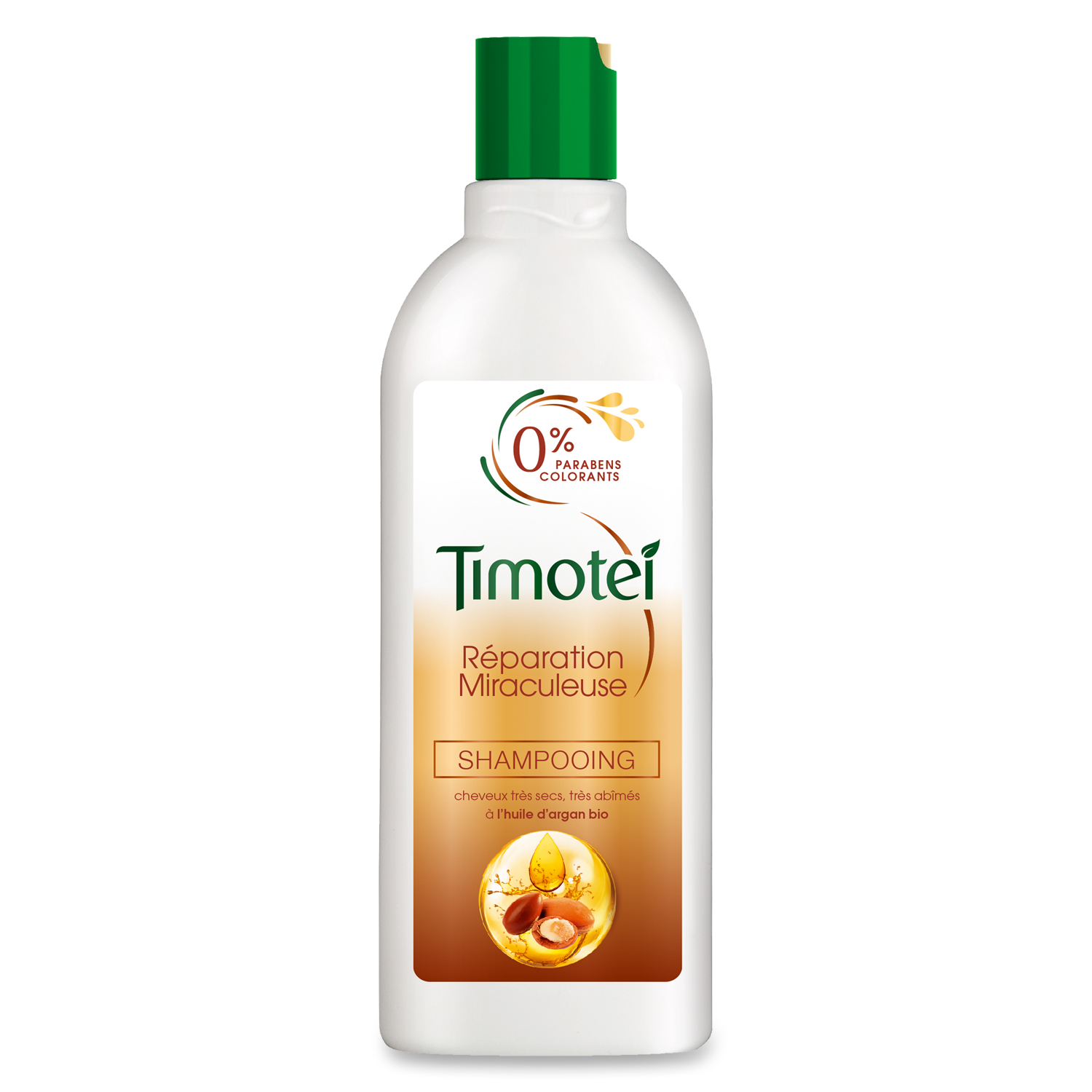 Le shampooing Timotei Réparation miraculeuse est fait pour les cheveux très abîmés. Sa formule enrichie à l'Huile d'Argan Bio réduit la casse des cheveux jusqu'à 96%*. Elle les répare et les nourrit pour les laisser visiblement brillants et forts. (*Test instrumental, réduction de la casse en utilisant le shampooing et l'après-shampooing en comparaison à un shampooing classique) Depuis toujours, des soins capillaires inspirés par la nature Dès sa création dans les années 1980, Timotei s’est fixé un objectif simple : sélectionner dans la nature les meilleurs ingrédients et les associer dans des formules expertes pour créer des soins adaptés à chaque type de cheveux. Timotei figure parmi les premières marques* à avoir créé des soins capillaires s’inspirant de la nature. Son Histoire a commencé il y a une trentaine d’années, lors de l’élaboration d’un shampooing enrichi en extraits naturels d'herbes. Ce shampooing était tellement doux qu’il pouvait être utilisé tous les jours. Ce fut unvrai succès ! Depuis, Timotei s’applique à développer de nouvelles formules avec des ingrédients d'origine naturelle ou bio connus pour leurs vertus multiples afin de répondre aux besoins de tous les types de cheveux (des cheveux gras aux cheveux secs, des cheveux bruns aux cheveux blonds vous proposant du shampooing, de l’après shampooing, des laques, gels ou encore du shampoing sec). Timotei prend soin des cheveux de toute la famille, petits ou grands. Par ailleurs, conscients de l’importance de préserver la planète, Timotei s’efforce de réduire son impact environnemental. Tous les flacons sont 100% recyclables, et ceux des shampooings et après-shampooings sont fabriqués avec 25% de plastique recyclé. La marque est partenaire d’Eco-Emballages pour promouvoir, organiser et financer le tri et le recyclage des emballages ménagers. Afin de vous aider à bien les trier, les consignes de tri sont indiquées sur les emballages des produits Timotei. Timotei - la beauté sans artifice *marques de grandes et moyennes surfaces Shampoing