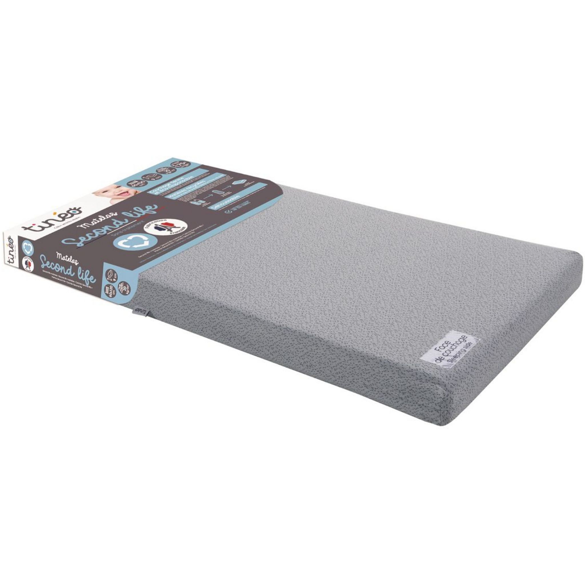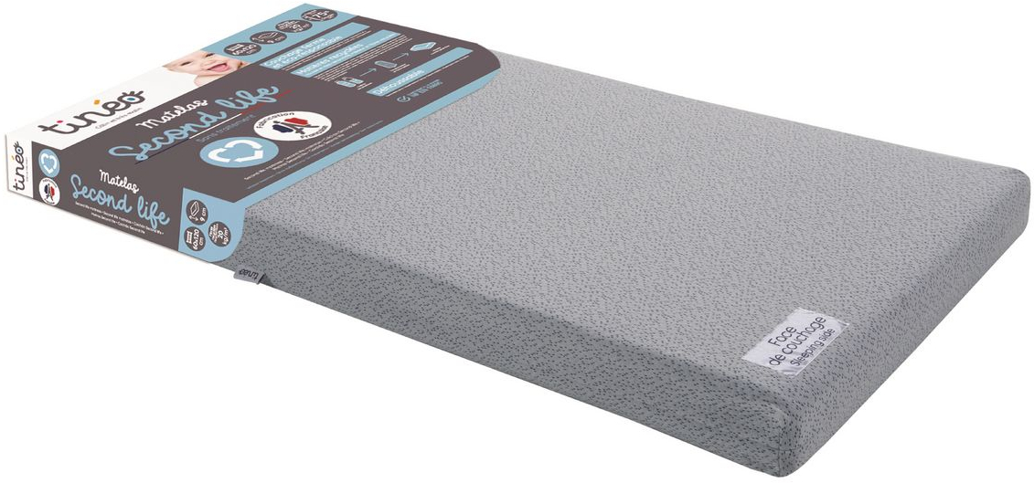 Le matelas nouvelle génération TINEO Second life est composé d’un bloc de fibres recyclées 20 kg/ m3. Coutil en tissu Second Life : matière polyester issue du recyclage des polyéthylènes qui une fois triés sont transformés en fil de polyester. La fibre offre un accueil ferme, recommandé pour le couchage des tout petits. Pratique et facile d’entretien, il est déhoussable. Conforme aux exigences de sécurité. Fabrication Française