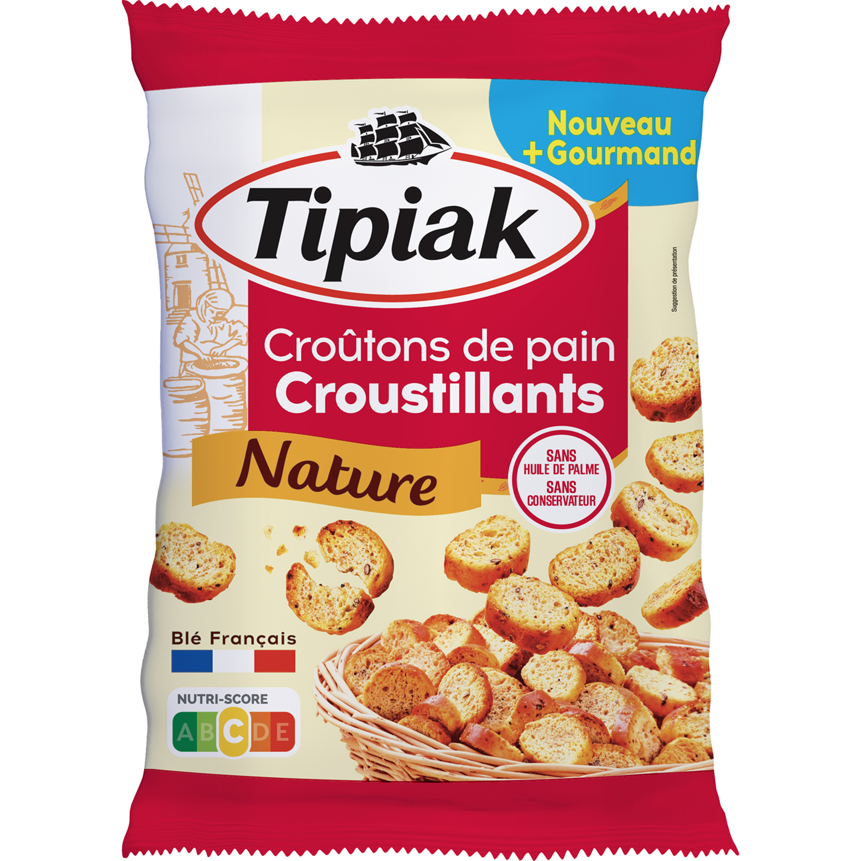Découvrez les nouveaux croûtons grillés Tipiak. Ces produits nature au goût de pain sont légers, croustillants, dorés au four et avec des graines (lin, quinoa, pavot) pour plus de gourmandise et de fibres. Blé 100% français. Sans conservateur. Sans huile de palme. Fabriqué en Normandie à Pont l’Evêque.