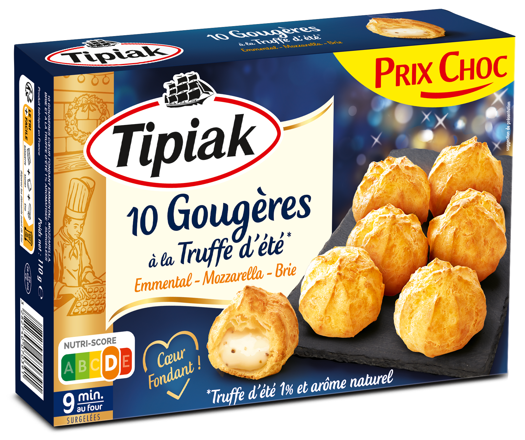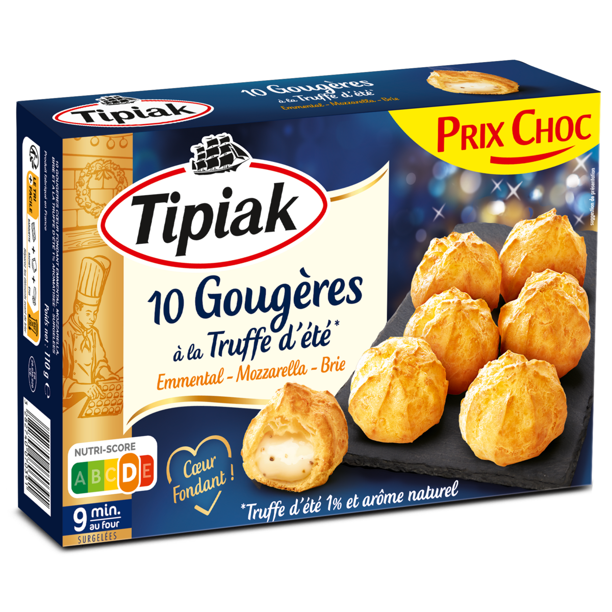 10 Gougères garnies d'une sauce aux fromages (emmental, mozzarella, brie) et à la truffe d'été 1% aromatisée, surgelées