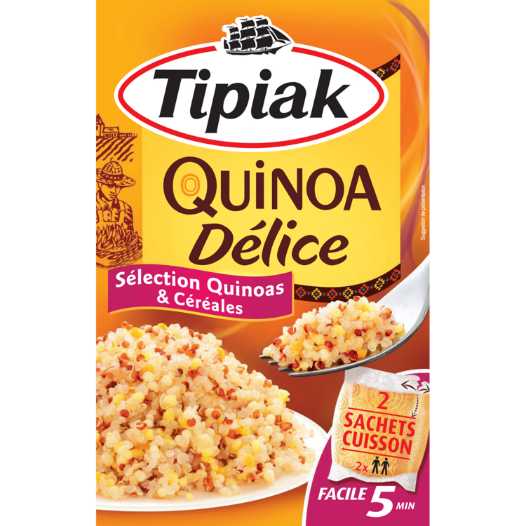Préparation à base de quinoas, semoule de blé dur précuite, blé dur précuit et semoule de maïs précuite. Invitez le quinoa et ses bienfaits nutritionnels à votre table avec Quinoa Délice, un mélange savoureux de quinoas et de céréales qui plaira à toute la famille, réussi en 5 minutes seulement.