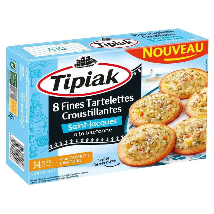 8 Fines Tartelettes Croustillantes Saint Jacques* à la bretonne surgelées Tipiak revisite la Tartelette et invente une recette gourmande à la Saint-Jacques, idéale pour vos apéritifs dinatoires : les Fines Tartelettes Croustillantes Saint-Jacques à la Bretonne