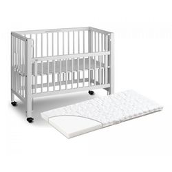 Le lit d'appoint tiSsi® est parfait dès le premier jour. Les nouveau-nés ressentent la sécurité de leurs parents et ont donc un bien meilleur sommeil la nuit que s'ils sont laissés seuls et livrés à eux-mêmes. La grille frontale a une hauteur ouverte de 51 cm mesurée à partir du sol, si la grille devait déranger, vous pouvez également monter le lit sans grille, le plan de couchage peut être monté sans palier sur une hauteur de 24 cm à environ 65 cm. Caractéristiques de l'article : Fabriqué en bois de hêtre massif. Rouleaux avec freins Plan de couchage : 40 x 90 cm. taille du lit : L/H/D. 95 x 81 x 45 cm réglable en continu en hauteur de 24 à 65 cm environ. Lit avec grille de verrouillage 4 roulettes avec frein de stationnement incl. Sangle de fixation pour le lit des parents. Matelas : ?90 x 40 x 4 cm. 2.8 kilogrammes. ?Avec rembourrage en mousse. Haut: 62% Coton 38% Matelassage en Tencel avec Polyester bas: 52% Polyester 48% Coton Noyau: Mousse Fine et douce. Housse multifonction avec protection intégrée contre l'humidité