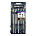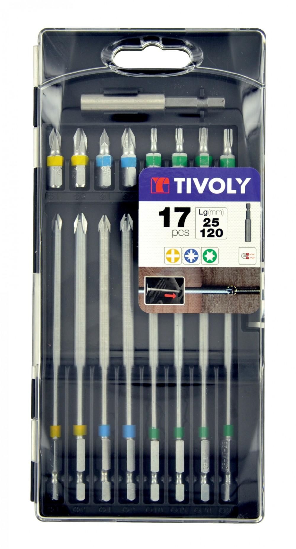- Composition du coffret (nombre et type de pièces): 17 pièces: pour la longueur 25 mm, PH n° 1,2, PZ n° 1,2, Tx n° 10, 15, 20, 25 et pour la longueur de 210 mm, PH n° 1,2, PZ n° 1,2, Tx n° 10, 15, 20, 25