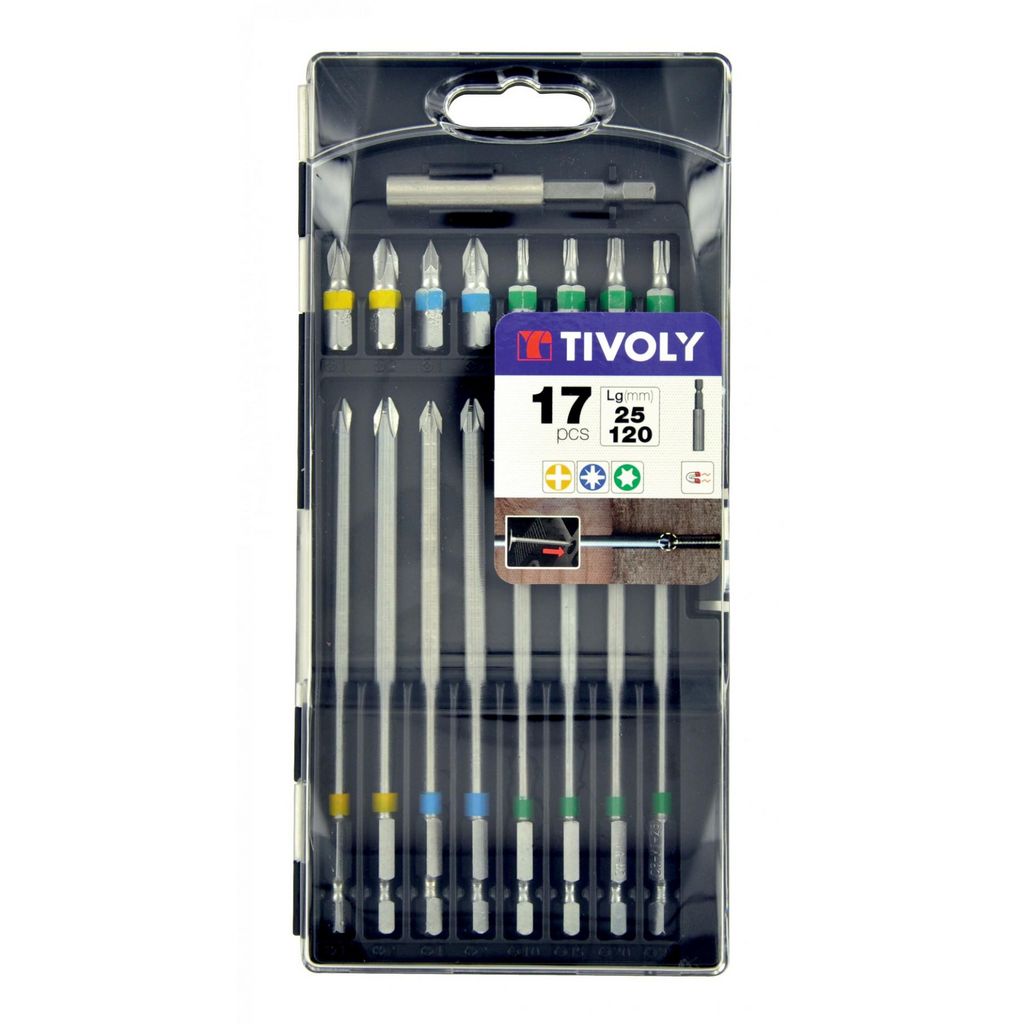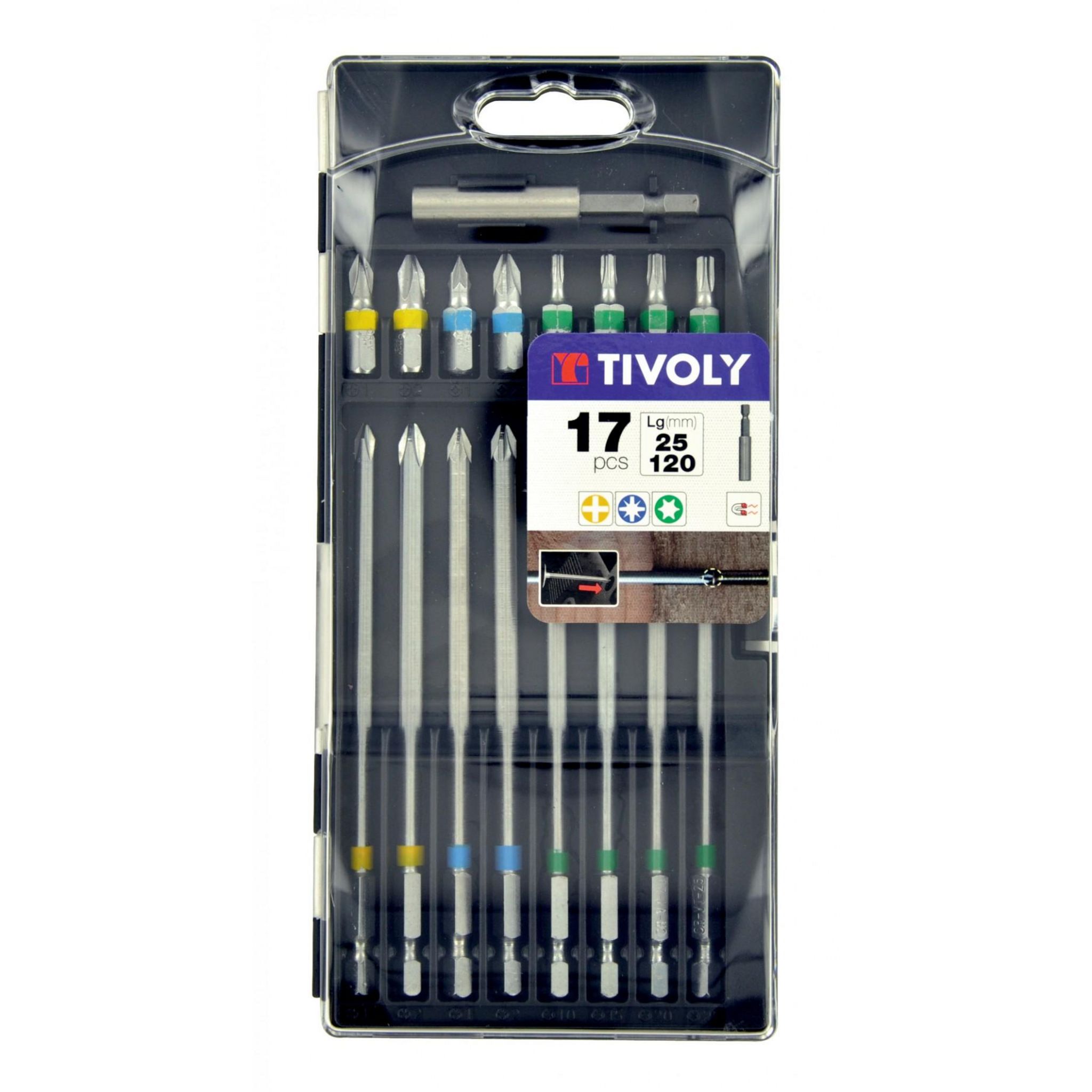 Pour le vissage de tout type de visComposition du coffret (nombre et type de pièces): 17 pièces: pour la longueur 25 mm, PH n° 1,2, PZ n° 1,2, Tx n° 10, 15, 20, 25 et pour la longueur de 210 mm, PH n° 1,2, PZ n° 1,2, Tx n° 10, 15, 20, 25Matière principale: Acier Chrome-molybdèneLongueur de l'embout