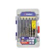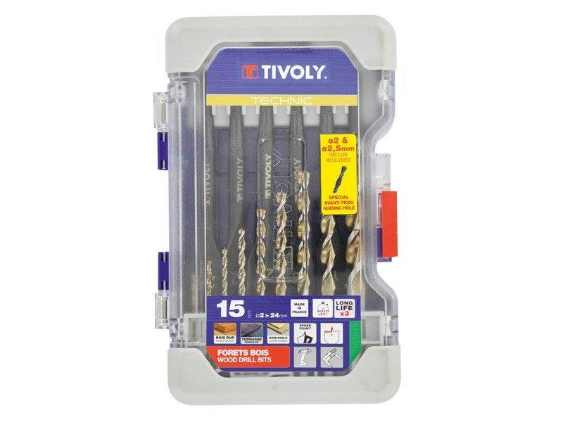 - Composition du coffret (nombre et type de pièces): 9 forets bois 3 pointes 2-2,5-3-4-5-6-8-10mm et 6 mèches bois plates 14-16-18-20-2-24mm