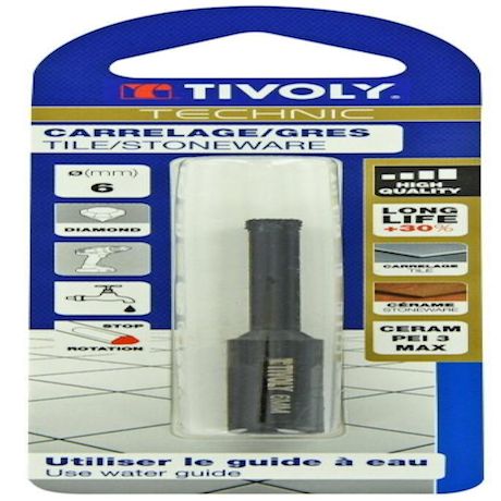 Produit emballé : poids (en kg) : 0.027Produit emballé : largeur (en cm) : 5Produit emballé : hauteur (en cm) : 15Produit emballé : profondeur (en cm) : 1.5Diamètre (en mm) : 6Marque du produit : TIVOLYMatière à travailler : CarrelageEmmanchement : CylindriqueLongueur de travail (en mm) : 35Longueur