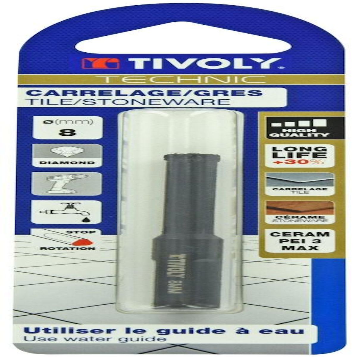 Produit emballé : poids (en kg) : 0.029Produit emballé : largeur (en cm) : 5Produit emballé : hauteur (en cm) : 15Produit emballé : profondeur (en cm) : 1.5Diamètre (en mm) : 8Marque du produit : TIVOLYMatière à travailler : CarrelageEmmanchement : CylindriqueLongueur de travail (en mm) : 35Longueur