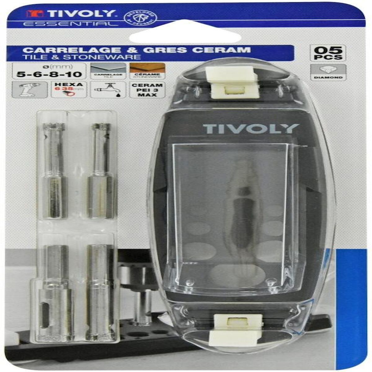 - Composition du coffret (nombre et type de pièces) : 5- 6- 8- 10mm + 1 guide de perçage - BLISTER