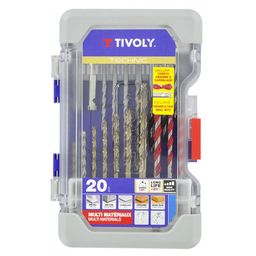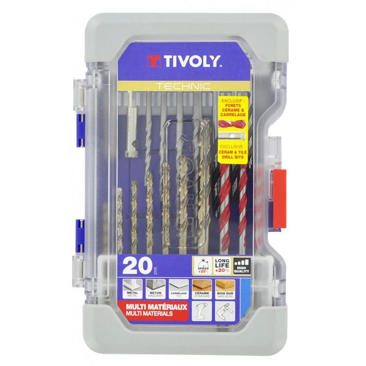 - Composition du coffret (nombre et type de pièces): 20 Forets mixtes multi – matériaux: 7 forets métaux HSS taillés meulés Gold affûtage pointe en croix Ø 3-3,5-4-4,5-5-6-8 mm- 4 forets béton Extra à plaquette carbure Ø 4-5-6-8 mm- 3 forets carrelage à plaquette carbure affûtage spécial Ø 5-6-8 mm- 2 forets grès Céram à concrétion diamant Ø 6-8 mm- 4 forets bois 3 pointes Ø 3-4-5-6 mm