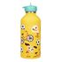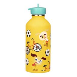 Gourde pour enfant 17 cm x 6,5 cm en acier inoxidable de couleur jaune avec motifs chiens, ballons de foot, vélos et skate.
