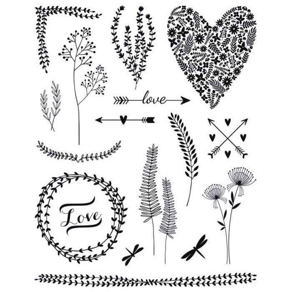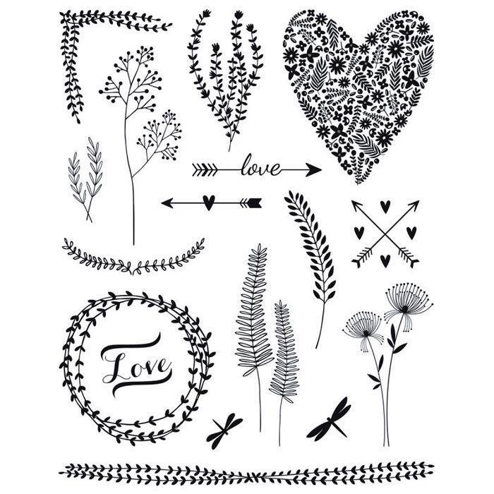 Pour customiser un album ou personnaliser des créations sur le thème vintage ou du passé, ce set de tampons transparents sur un thème végétal de 14 x 18 cm est idéal. Ces 17 tampons transparents sur un thème végétal représentent une couronne de fleurs, des flèches, des cœurs, love, des pissenlits, une libellule Dimensions 14 x 18 cm.