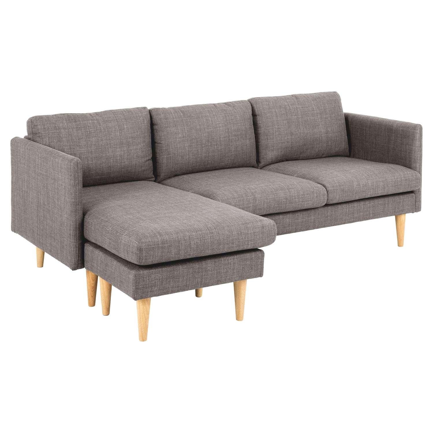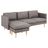 Ce canapé est livré avec des ressorts ensachés pour plus de confort et une méridienne. Vous n'avez pas besoin de choisir un côté : vous pouvez changer de côté à votre guise grâce à la méridienne fixe réversible. Le canapé est recouvert d'un tissu gris-marron clair à effet bicolore. Il est assorti à des pieds effilés en bois teinté chêne pour un look léger et moderne.