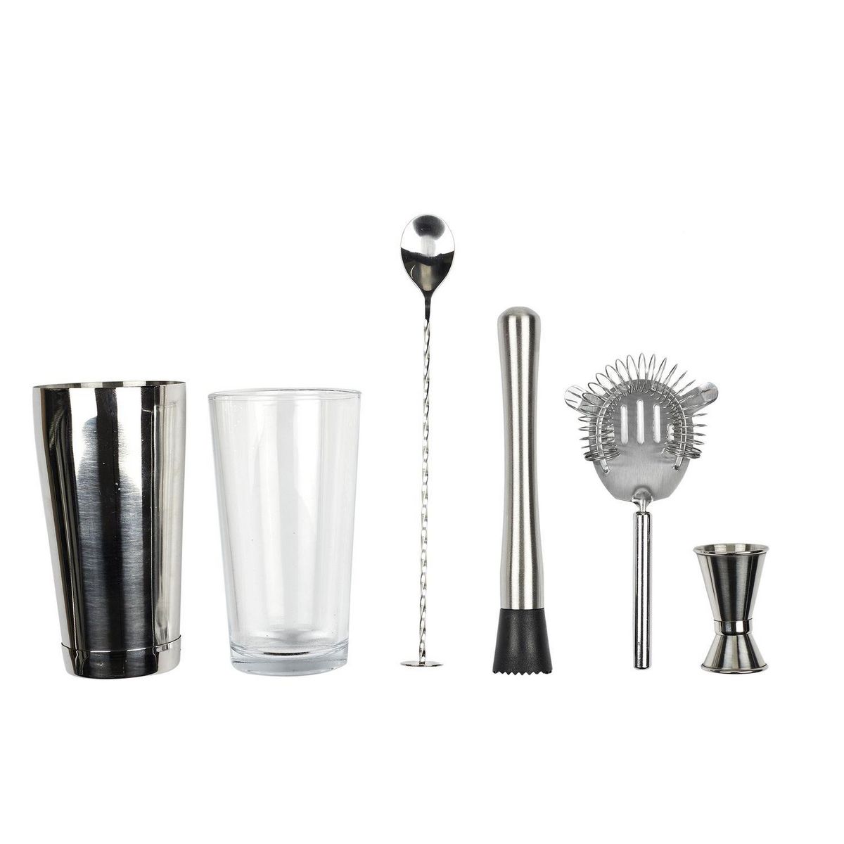 Ce set pour réaliser des cocktails sera du plus bel effet dans votre bar. FICHE TECHNIQUE- Set à cocktail.- Couleur : Argent.- Matière : Acier Inoxydable, Verre et Plastique.- Contient 5 accessoires.- Un shaker, un jigger, une cuillère de bar, un pilon et une passoire de bar 4 crochets.- La passoire