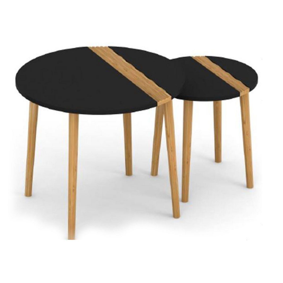 Modulez l'espace dans votre salon en fonction du nombre de convives en adoptant ce duo de tables gigognes. Vous serez séduit par leur look bicolore.FICHE TECHNIQUE- Lot de 2 tables Gigogne.- Matière : Bambou et MDF.- Couleurs : Noir et bois.- Détail : Plateau Bicolore.- Collection : Relief.- A monte