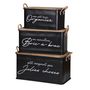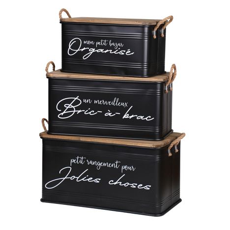 On adore ce trio de boites en métal qui mixe parfaitement les styles : le brut de l'industriel et la douceur du Bohème.FICHE TECHNIQUE- Lot de 3 boites de rangement.- Couvercle en MDF.- Boite en métal.- Détail : Poignées en corde.CARACTERISTIQUES TECHNIQUES- Dimensions du grand modèle : Longueur 68