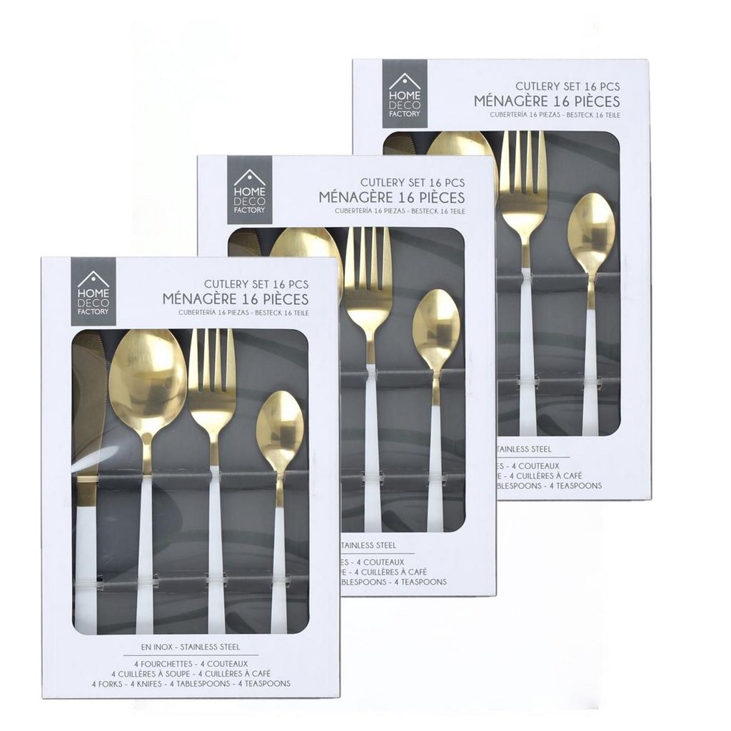 Lot de 3 Ménagères table chic - 48 Couverts - Blanc et doré