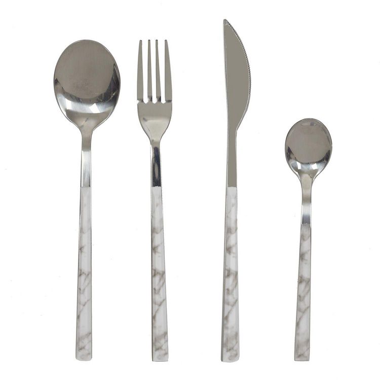 Cette jolie ménagère 16 pièces effet marbre sera du plus bel effet sur vos tablées. Elle contient : 4 fourchettes, 4 couteaux, 4 cuillères à soupe et 4 cuillères à café.FICHE TECHNIQUE- Ménagère.- Matière : en acier inoxydable.- Matière des manches : Plastique - polypropylène.- Kit de 16 pièces cont