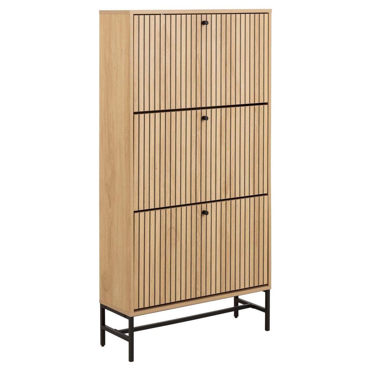 Le meuble à chaussures Baïkal en chêne, avec sa façade lamellaire, allie design moderne et fonctionnalité. Les éléments géométriques apportent de la profondeur et du style, tandis que ses 3 compartiments offrent un rangement discret et pratique pour garder vos chaussures en ordre.FICHE TECHNIQUE- Co
