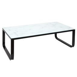Cette jolie table basse en verre marbré blanc sera parfaite pour compléter le mobilier du salon. Vous tomberez sous le charme de ce mélange de styles très tendance.FICHE TECHNIQUE- Table Basse rectangulaire.- Plateau avec effet marbre.- Matière : structure en métal et plateau en verre trempé.- Coule