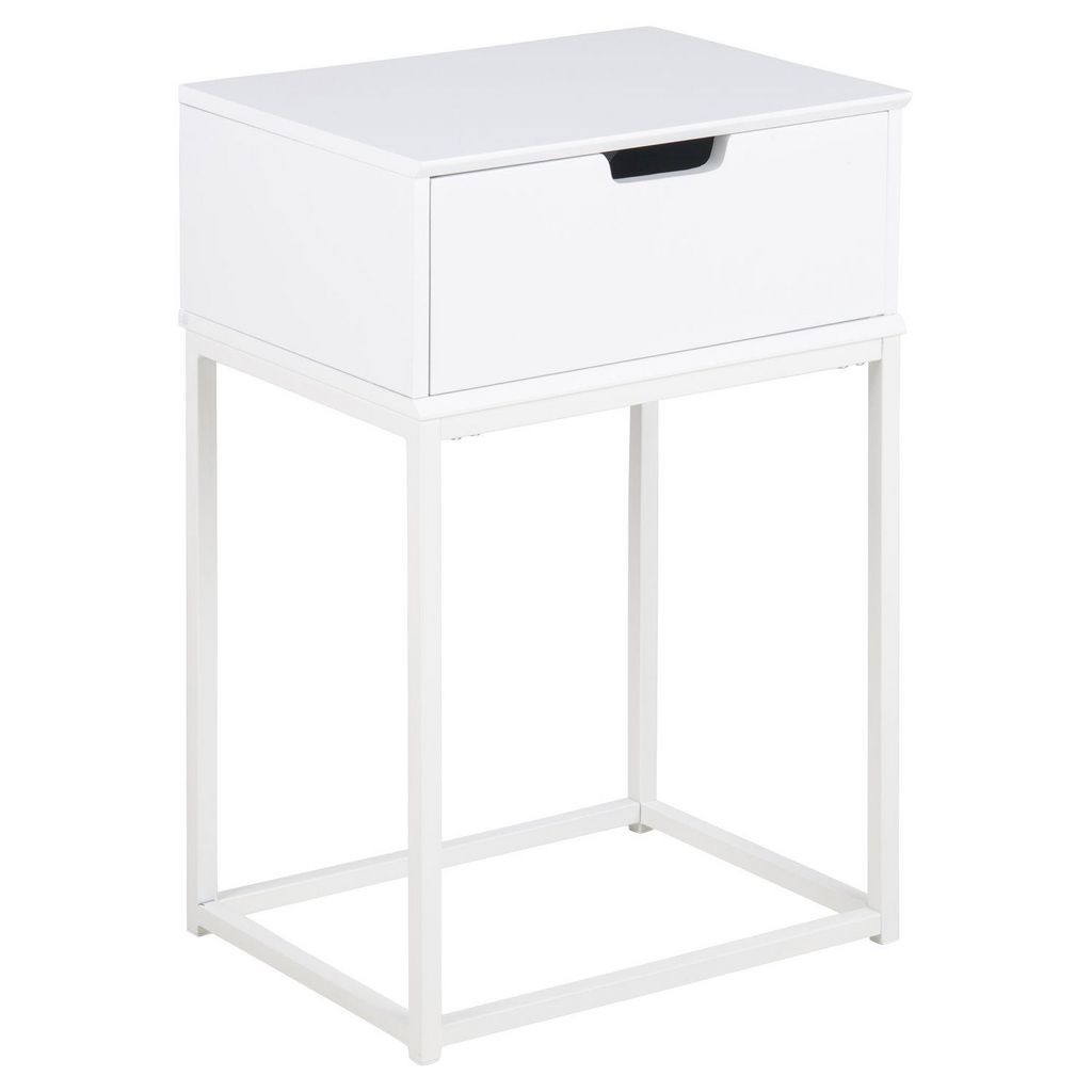 Sublimez votre chambre avec cette élégante table de chevet. Le tiroir en bois offre un rangement pratique afin que vous puissiez garder vos essentiels près du lit. Le plateau blanc se marie parfaitement avec la base métallique enduite de poudre. Remarquez la poignée intégrée pour un détail élégant.