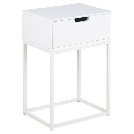 Sublimez votre chambre avec cette élégante table de chevet. Le tiroir en bois offre un rangement pratique afin que vous puissiez garder vos essentiels près du lit. Le plateau blanc se marie parfaitement avec la base métallique enduite de poudre. Remarquez la poignée intégrée pour un détail élégant.F