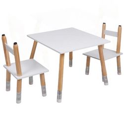 Cet ensemble table et deux chaises complètera joliment un mobilier de chambre d'enfant.