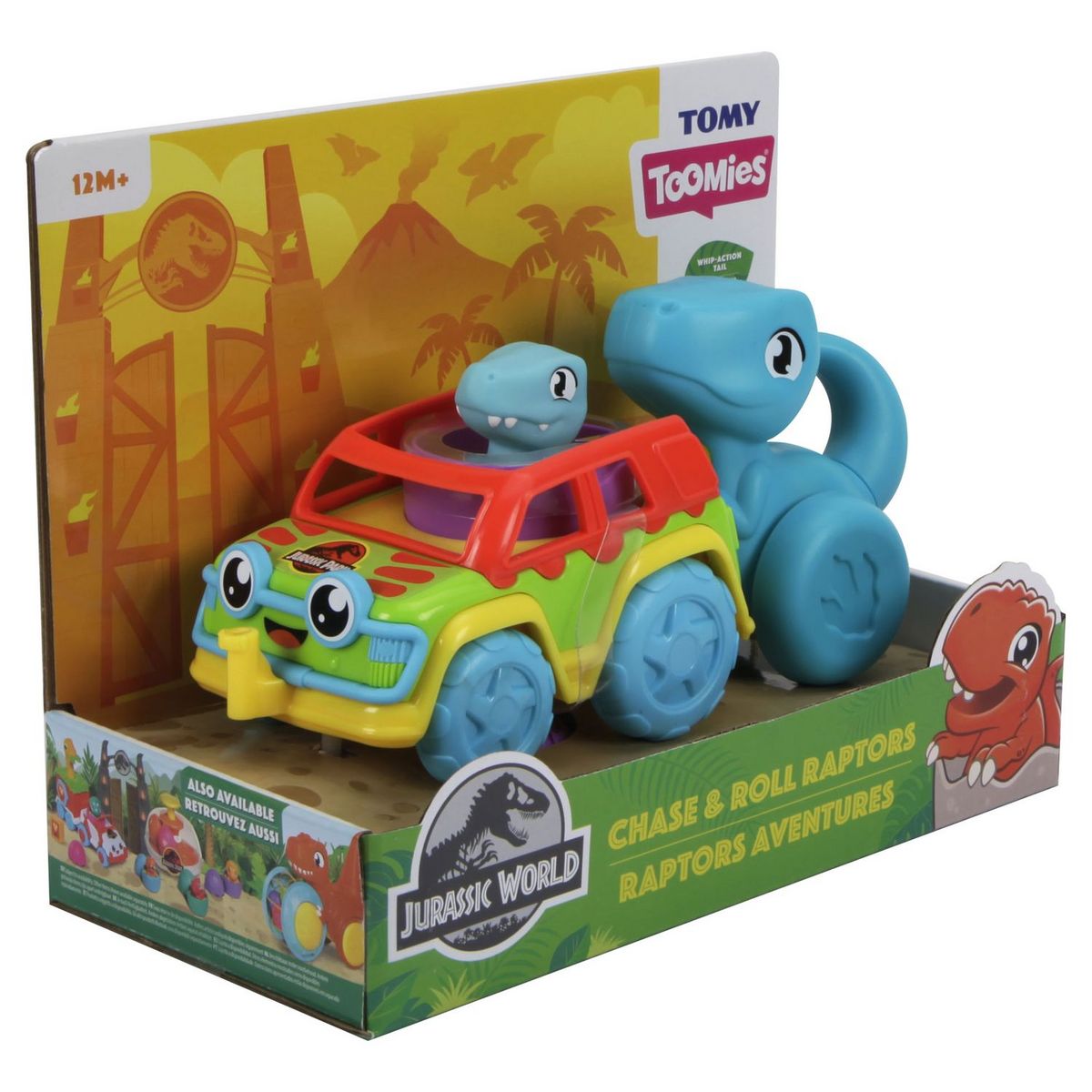 Ce jouet comprend 3 éléments : bébé Raptor dans sa coquille, la voiture Jurassic Park et Maman Raptor. Bébé s’amuse à faire rouler la voiture avec bébé Raptor confortablement assis à l’intérieur. En faisant avancer Maman Raptor, bébé découvre sa queue bouger d’un côté et de l’autre et se connecte également à l'arrière de la voiture.