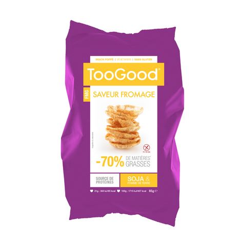 TooGood Soja, des snacks apéritifs jamais frits ou cuits, pour proposer une alternative plus vertueuse aux chips classiques. Soufflés à haute température sans matières grasses, TooGood est source de protéines, riche en fibres et sans gluten, un snack déculpabilisant idéal pour combler les petites faims de la journée et offrir un apéritif idéal à vos amis.