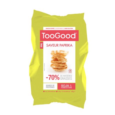 TooGood Soja, des snacks apéritifs jamais frits ou cuits, pour proposer une alternative plus vertueuse aux chips classiques. Soufflés à haute température sans matières grasses, TooGood est source de protéines, riche en fibres et sans gluten, un snack déculpabilisant idéal pour combler les petites faims de la journée et offrir un apéritif idéal à vos amis.