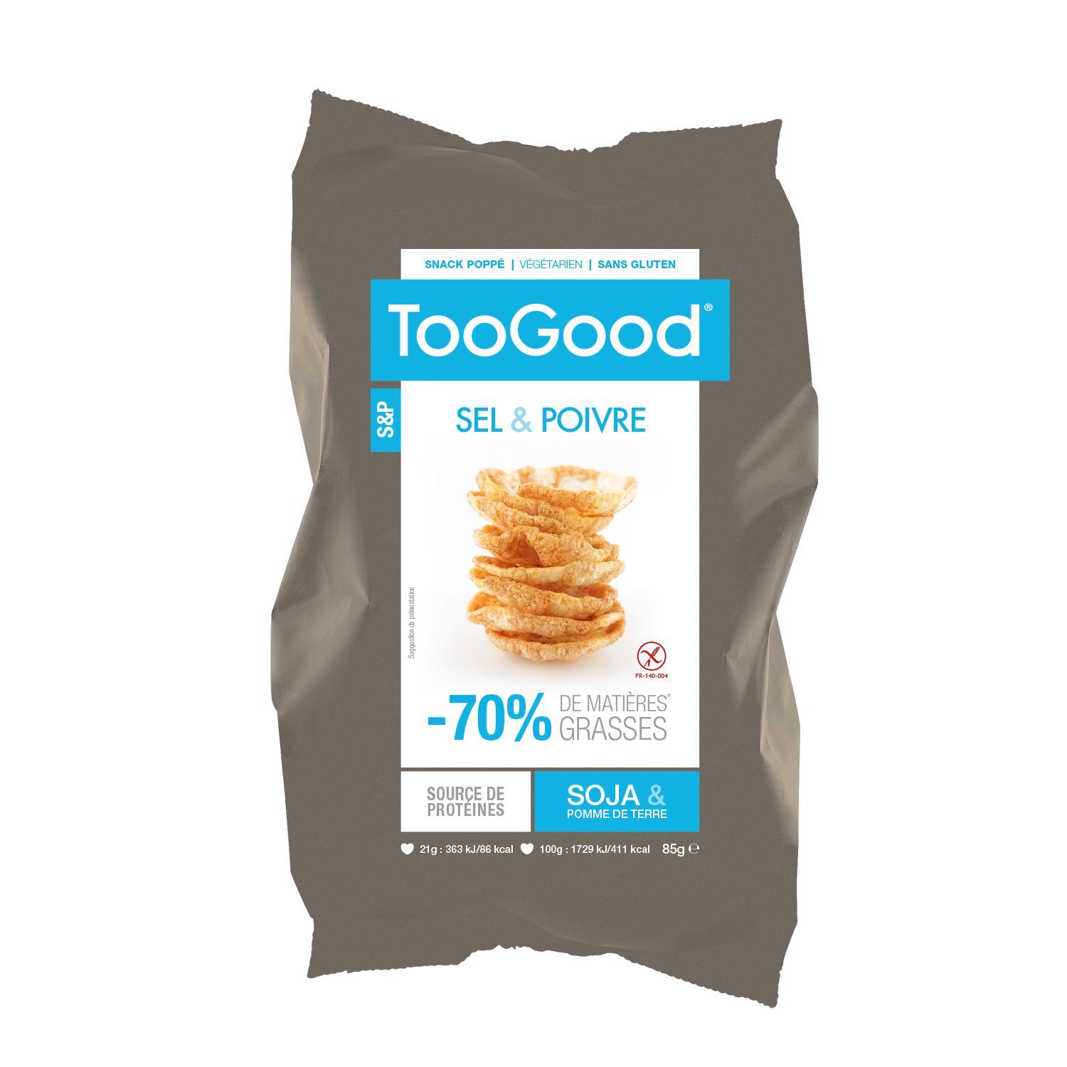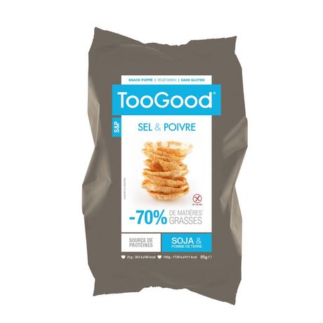 TooGood Soja, des snacks apéritifs jamais frits ou cuits, pour proposer une alternative plus vertueuse aux chips classiques. Soufflés à haute température sans matières grasses, TooGood est source de protéines, riche en fibres et sans gluten, un snack déculpabilisant idéal pour combler les petites faims de la journée et offrir un apéritif idéal à vos amis.