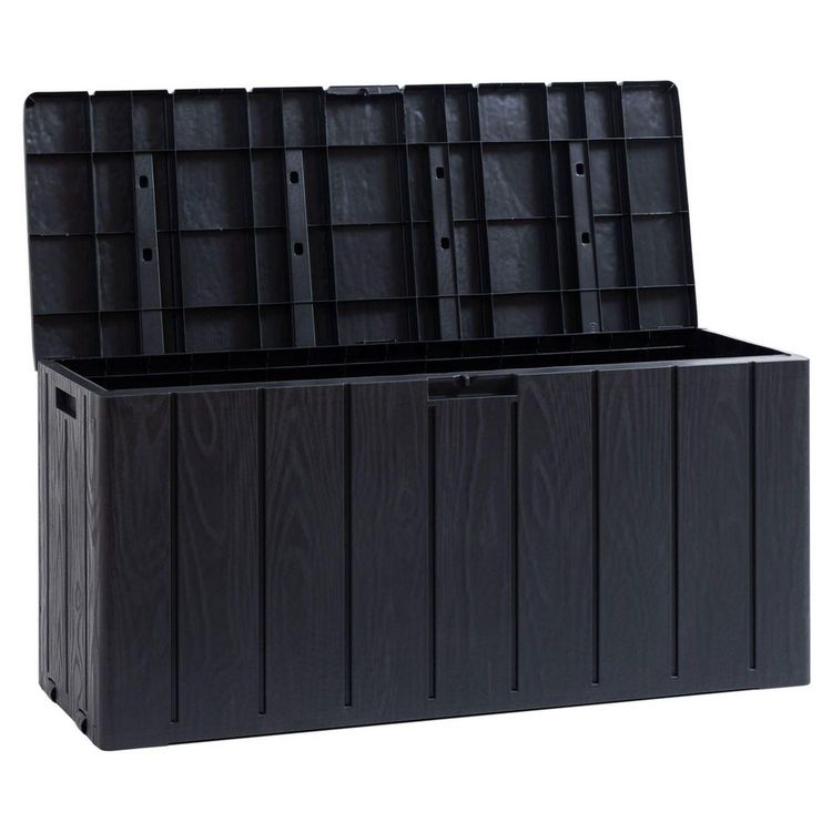 Dimensions ext. hors tout (LxPxH) : 117,5 x 45 x 56 cm / Dimensions int. (LxPxH) : 112 x 37 x 49,3 cm / Poids : 6,60 kg / Capacité : 270 L / Matériaux : Polypropylène 100% recyclé / Coloris : Noir anthracite / Capacité d’assise : 2 personnes / Résistance à la charge : 220 kg / Fermeture avec cadenas <6 mm (cadenas non inclus) / Montage avec outils (non inclus) / Made in Italy / Traité anti-UV