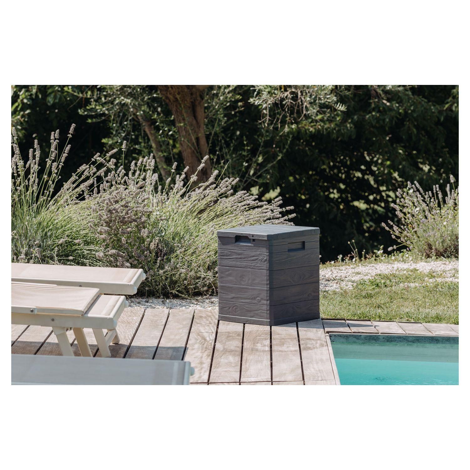 Le Coffre de Jardin en Résine MULTIBOX WOODY 90 associe compacité et élégance pour répondre à vos besoins de rangement extérieur. Avec une capacité de 90 litres et une finition anthracite contemporaine, ce coffre offre une solution pratique tout en ajoutant une touche moderne à votre jardin ou terra