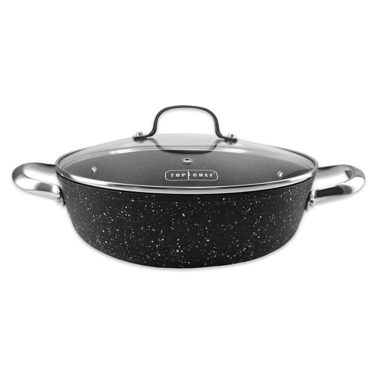 En savoir +Type de produit : cuisson - Compatibilité lave-vaisselle : oui - Couleur : Noir - Matière : Aluminium et acier inox - Matière de la poignée : acier - Dimension : diam 28 cm / hauteur 13,5 cm - Revêtement anti adhésif : oui - Système de fermeture : couvercle simple en verre