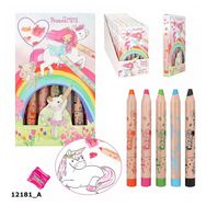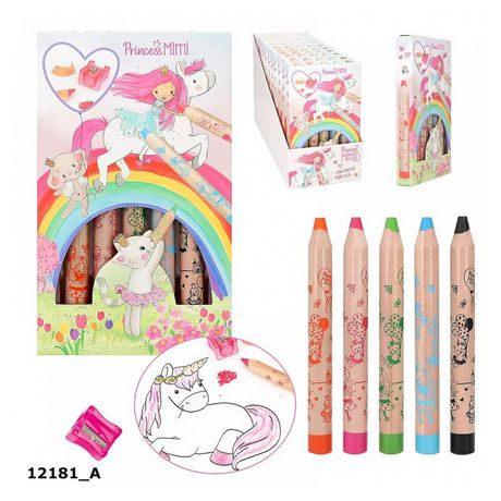 Ces 5 crayons de couleur épais de Princess Mimi en orange, rose vif, vert, bleu et noir sont parfaitement adaptés aux besoins des petites mains créatives. Chaque crayon est doté d'un mignon imprimé all-over en accord avec la couleur respective du crayon. Le lot inclut également un taille- crayon rose vif assorti.