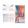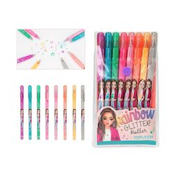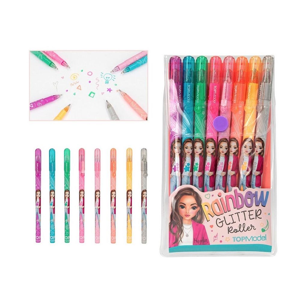 Un arc-en-ciel pailleté : ces 8 stylos de TOPModel à l'encre pailletée rose, rose vif, jaune, orange, mauve, verte, turquoise et grise propagent la bonne humeur à chaque trait. Emballés dans une pochette transparente. Les mines ne sont pas remplaçables.