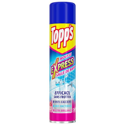Avec Topp's, nettoyez sans frotter ! Sa mousse active agit seule rapidement. Elle nettoie facilement et sans frotter baignoire, lavabos, carrelages, cuvettes de WC, toutes surfaces emaillées et même la robinetterie. Utilisé régulièrement, il empêche l'accumulation du calcaire et élimine 99,9% des bactérie. Après utilisation, Topp's laisse une agréable odeur citronnée dans votre salle de bain.