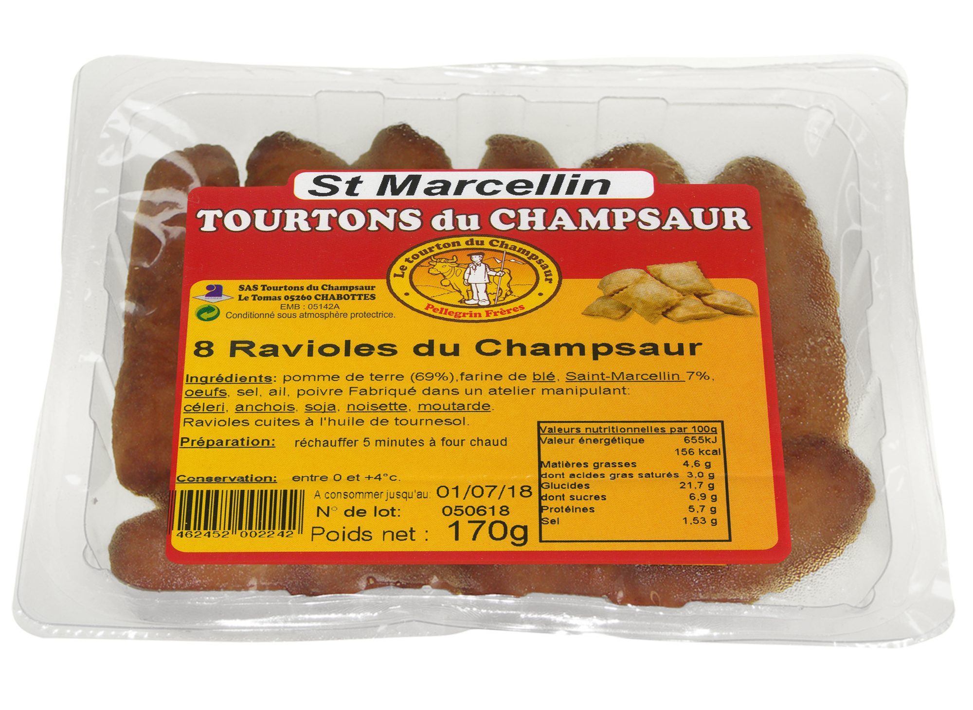 pomme de terre (69%), farine de BLE, SAINT MARCELLIN 7%, OEUF, sel, ail, poivre. Susceptible de contenir du CÉLERI, anchois, SOJA, NOISETTE, MOUTARDE. Ravioles cuites à l'huile de tournesol.