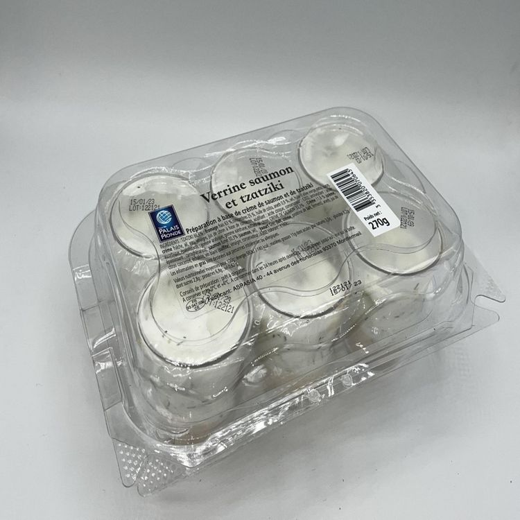 Couche n°2 : CREME SAUMON 33.3% : crème 11,6% (crème, épaississant : carraghénanes), saumon fumé 10.3% (saumon, sel), yaourt Grec (lait, crème, protéine de lait, ferment), aneth, jus de citron concentré, échalote, vin blanc (sulfite), conservateur : E202, colorant : E160c.