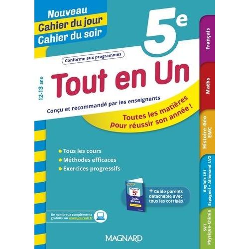 Toutes les matières pour réussir son année de 5e ! Toutes les matières réunies dans un même cahier pour réviser tout au long de l'année ou pendant les vacances : 27 séquences de Français : grammaire, conjugaison, orthographe, vocabulaire, expression écrite , 26 séquences de mathématiques : nombres et calculs, organisation de données, fonctions, espace et géométrie , 19 séquences d'histoire, géographie, enseignement moral et civique , 21 séquences de SVT-Physique/Chimie , 12 séquences d'anglais , 5 séquences d'espagnol , 5 séquences d'allemand. Une structure simple et efficace en 3 temps pour réviser tout le programme de 5e : 1/ Observer et retenir : le cours indisensable à connaître 2/ Savoir faire : une méthode pratique pour mettre en application la leçon 3/S'entraîner : des exercices progressifs pour s'entraîner. Avec en plus : Des quiz-bilans et des auto-évaluations + De vrais onglets couleurs pour un repérage facile de chaque matière. + Un guide parents détachable avec tous les corrigés.
