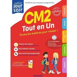 Conçu et recommandé par les enseignants Le tout en un pour réussir son année de CM2 - Conforme aux programmes - Toutes les matières : français, maths, histoire, géographie, EMC, sciences, anglais - Toutes les leçons avec de nombreux exemples - Des mémos visuels pour retenir l'essentiel - Des exercices progressifs pour s'entraîner efficacement - Des quiz bilans pour faire le point sur ses connaissances De nombreux + numériques via des QR codes : dictées audio, quiz interactifs, vocabulaire audio en anglais + Un livret détachable avec tous les corrigés et, pour les parents, des explications sur le programme scolaire.