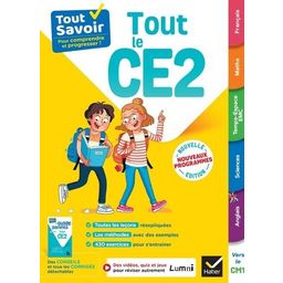 Un cahier de soutien avec toutes les matières du CE2. Sur toutes les notions du programme : une leçon visuelle, la méthode clé et des exercices progressifs. Idéal pour s'entraîner à la maison tout au long de l'année ou réviser pendant les vacances ! Un ouvrage structuré en 7 onglets pour comprendre, progresser et réussir son année ! - Dans le premier onglet Moi en CE2 , votre enfant est incité à réfléchir, à travers des activités, sur comment il apprend et comment il peut mieux apprendre. - Dans les onglets qui suivent, il retrouve toutes ses matières : français, maths, temps-espace-éducation morale et civique, sciences, anglais. Sur chaque notion du programme, une séquence de révisions lui est proposée. Elle comprend : un rappel de leçon clair et visuel, une méthode avec des exemples, des exercices progressifs et une vidéoLumni pour ancrer les apprentissages. - Le dernier onglet Vers le CM1 lui permet de découvrir, dans chaque matière, le programme de l'année suivante et d'identifier les notions incontournables. Le guide parents détachable - avec les corrigés détaillés de tous les exercices - des informations sur l'organisation des enseignements en CE2 - et des conseils pour bien accompagner votre enfant. En complément, un site d'entraînement pour réviser autrement En accès gratuit, avec l'achat du livre, sur (Lien -> http : //www. hatier-entrainement. com/) : - des exercices interactifs - des dictées sonorisées - des podcasts en anglais