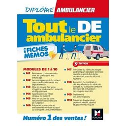 Une nouvelle édition revue, actualisée et enrichie. Des fiches synthétiques avec de nombreuses illustrations, des tableaux pour apprendre et réviser tout le programme d'ambulancier. Un format bloc pratique et nomade pour réviser partout. Tout pour réussir et valider votre diplôme ! Au sommaire : Module 1 - Relation et communication avec les patients et leur entourage Module 2 - Accompagnement du patient dans son installation et ses déplacements Module 3 - Mise en oeuvre des soins d'hygiène et de confort adaptés et réajustement Module 4 - Appréciation de l'état clinique du patient Module 5 - Mise en oeuvre de soins notamment ceux relevant de l'urgence Module 6 - Préparation, contrôle et entretien du véhicule adapté au transport sanitaire terrestre Module 7 - Conduite du véhicule adapté au transport sanitaire terrestre dans le respect des règles de circulation et de sécurité routière Module 8 - Entretien du matériel et des installations du véhicule adapté au transport sanitaire terrestre et prévention des risques associés Module 9 - Traitement des informations Module 10 - Travail en équipe pluri professionnelle, qualité et gestion des risques