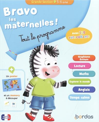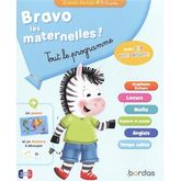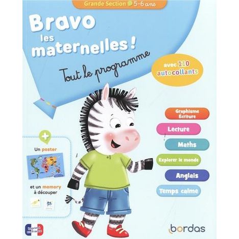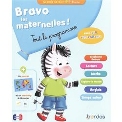 Bravo les maternelles - Tout le programme - Grande Section est un cahier rassurant et ludique qui permet à votre enfant de 5-6 ans de revoir toutes les notions abordées durant l'année de grande section. La mascotte Muso l'accompagnera tout au long de l'aventure et lui donnera des astuces pour réussir les activités, les jeux et les exercices de relaxation. Le cahier d'activités Bravo les maternelles - Tout le programme - Grande Section rassemble toutes les notions vues en alte et propose à l'enfant des activités ludiques, illustrées et progressives . Le cahier s'adresse également aux parents avec des conseils figurant au début de l'ouvrage. En Grande Section, l'enfant est accompagné tout au long du livre par le petit zèbre, Muso , qui lui pose des questions , lui donne des conseils , et l'encourage . Les notions se répartissent en 6 domaines : Graphisme/Ecriture : maîtrise du geste , reproduction de formes simples et complexes , entraînement à l'écriture de toutes les lettres en écriture cursive Lecture : compréhension d'histoires , identification des sons , lecture des premières syllabes et mots Maths : comparaison des quantités de 1 à 10 , écriture des chiffres , repérage sur un quadrillage Explorer le monde : repérage dans le temps et dans l'espace , découverte du vivant (animaux, plantes) , repérage des objets dangereux Anglais : apprentissage du vocabulaire le plus simple Temps calme : activités de respiration et de relaxation Et en + : + 110 autocollants en couleur Des activités manuelles Un poster en cadeau pour découvrir les animaux du monde Un grand jeu de memory des instruments de musique à fabriquer soi-même La collection Bravo les Maternelles se compose de : 4 cahiers tout-en-un pour revoir toutes les notions au programme de la toute petite section à la grande section , 4 supports effaçables de la toute petite section à la grande section , 4 blocs de coloriages variés et progressifs autour de thèmes attractifs , 3 gros cahiers d'activités : maths, anglais et multi matières 4 cahiers pour initier l'enfant aux graphismes, à l'écriture, à la lecture , 2 cahiers pour l'aider à améliorer sa concentration et à gérer ses émotions. Ce cahier est imprimé en France par un imprimeur certifié Imprim'vert.
