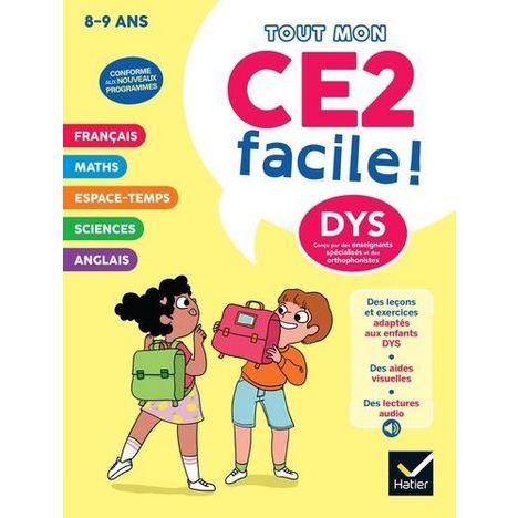 Toutes les matières du CE2 dans un ouvrage spécialement conçu pour les enfants dyslexiques ou en difficulté d'apprentissage par des orthophonistes et des enseignants spécialisés. Le cahier propose, pour chaque matière du programme de CE2 (français, maths, espace-temps, sciences et anglais), des leçons suivies d'exercices clairs, aérés et adaptés. L'enfant peut s'entraîner à son rythme et ainsi prendre confiance en lui. Les corrigés de tous les exercices sont présentés en fin d'ouvrage, accompagnés de conseils à destination des parents. De nombreux dispositifs facilitent l'apprentissage : - une police de caractère Open Dyslexic pour une lecture plus facile , - des consignes découpées en syllabes pour aider au déchiffrage , - des pictogrammes pour comprendre immédiatement la consigne , - un fond jaune sous les exercices pour limiter la fatigue visuelle , - 4 filets de couleur pour baliser l'espace de travail et le sens de lecture de la double page , - des leçons lues (accessibles par un code à scanner) pour faciliter la compréhension. Un contenu adapté aux attendus du programme de CE2.