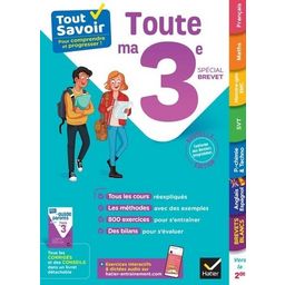 Un ouvrage avec toutes les matières de la 3e. Sur chaque notion du programme : un cours visuel, la méthode clé et des exercices. Idéal pour préparer les contrôles tout au long de l'année et réussir son brevet. Un onglet par matière et un ongle Spécial brevet - L'ouvrage est structuré à l'aide d'onglets permettant de retrouver facilement la matière sur laquelle on veut travailler : français, maths, histoire-géographie, EMC, physique-chimie, SVT, technologie, anglais, espagnol. - A chaque thème au programme d'une matière est associée une séquence de révision sur une double-page, qui comprend : - un rappel de cours clair et visuel - une méthode appliquée à des exemples - des exercices progressifs (corrigés dans le guide parents) Tout au long de ses révisions, votre enfant est accompagné et conseillé. - Un onglet contient des brevets blancs pour les 4 épreuves de l'examen. En plus : les deux onglets Moi en 3e et Vers la 2de - Les activités proposées dans l'onglet Moi en 3e incitent votre enfant à réfléchir sur son profil d'apprentissage et les méthodes à mettre en oeuvre pour être plus efficace. - Le dernier onglet Vers la 2de lui permet de découvrir, dans chaque matière, le programme de l'année suivante et d'identifier les notions incontournables. Le guide parents détachable - Ce guide vous donne accès aux corrigés détaillés de tous les exercices - Vous sont proposés également des informations sur l'organisation des enseignements en 3e, l'orientation en fin de 3e et des conseils pour bien accompagner votre enfant. Un site d'entraînement pour réviser autrement En accès gratuit, avec l'achat du livre, sur www. hatier-entrainement. com : - des exercices interactifs en français et en mathématiques - des dictées sonorisées - des quiz audio en anglais et en espagnol